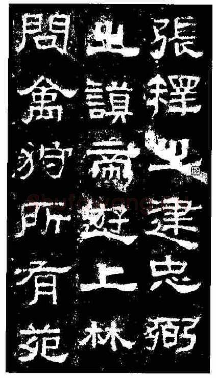 二、《张迁碑》用笔以方为主,是汉隶中方笔的典型代表。其笔画厚重质朴,骨力劲健,再加上篆籀笔意的运用,使其古拙中有一股雄秀之气。其结体常于平稳中见奇崛,静中寓动,错综而富于变化。初看此碑似有笨拙之感然细细咀嚼,则会领略出其体态变化多端、疏密得体、错落有致、方圆兼备的在巧拙之妙。特别是碑阴之字,似不经意,但其意态上的雄健高古之气尤为明显。明代孙退谷《庚子销夏记》评其书云:“书法方整尔雅,汉石中不多见者。”清郭沿先则称此碑为“是碑为冠”(《芳坚馆题跋》)。