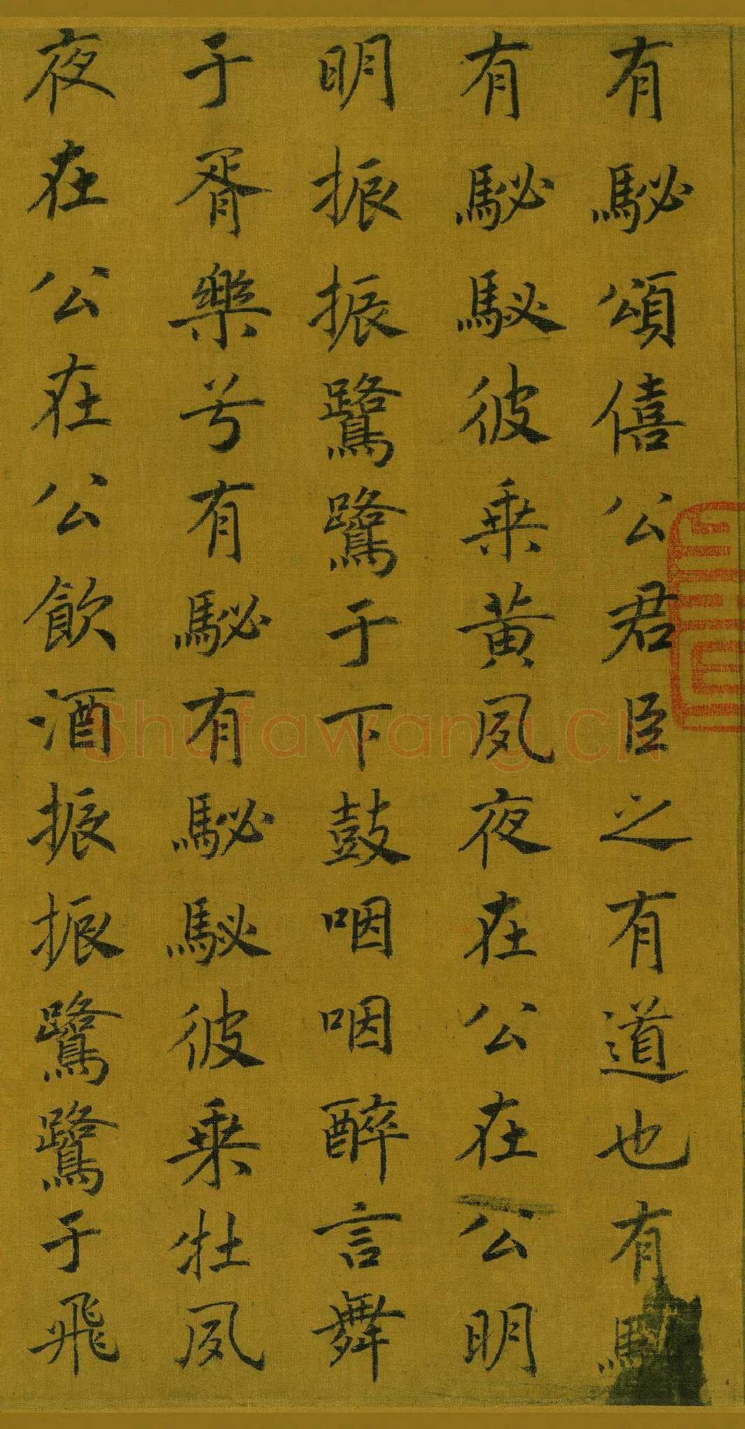 【5】《有駜》,颂僖公君臣之有道也。有駜有駜,駜彼乘黄。夙夜在公,在公明明。振振鹭,鹭于下。鼓咽咽,醉言舞。于胥乐兮!有駜有駜,駜彼乘牡。夙夜在公,在公饮酒。振振鹭,鹭于飞。