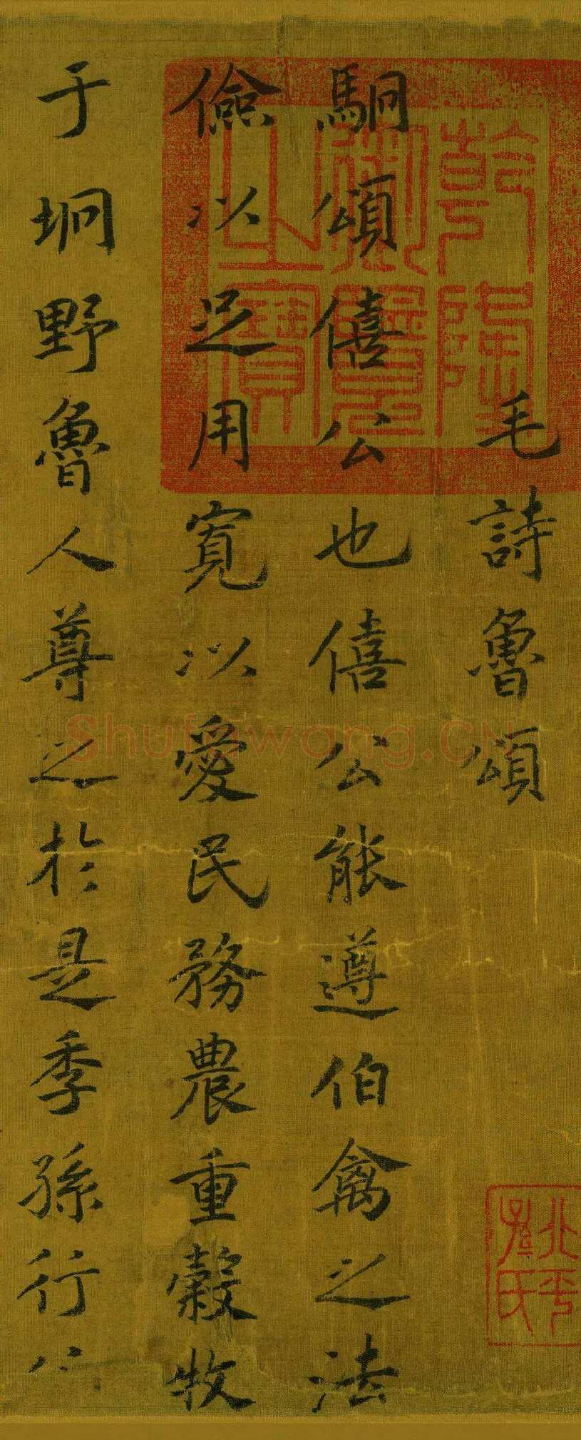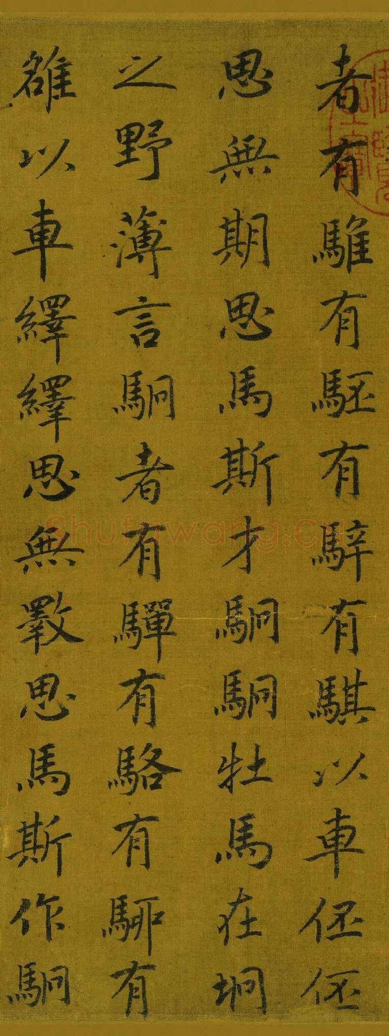 宋高宗赵构小楷《鲁颂三篇》,藏于辽宁省博物馆。《鲁颂三篇图卷》为高宗时期画家马和之所作,为南宋宫廷画院中官品最高的画师,居御前画院十人之首。