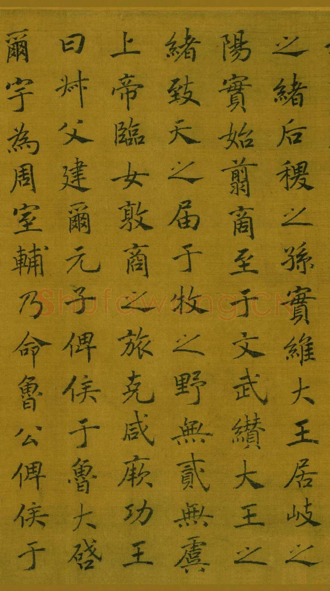 【8】之绪。后稷之孙,实维大王。居岐之阳,实始翦商。至于文武,缵大王之绪,致天之届,于牧之野。无贰无虞,上帝临女。敦商之旅,克咸厥功。王曰:叔父!建尔元子,俾侯于鲁。大启尔宇,为周室辅。乃命鲁公,俾侯于