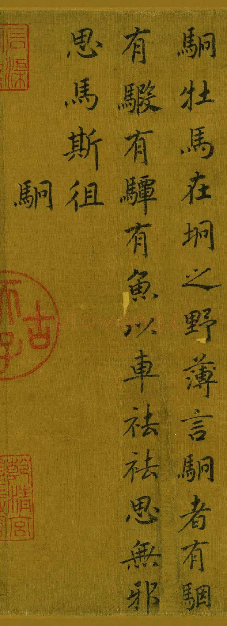 【3】者!有驈有皇,有骊有黄,以车彭彭。思无疆,思马斯臧!駉駉牡马,在垧之野。薄言駉者!有骓有駓,有骍有骐,以车伾伾。思无期,思马斯才!駉駉牡马,在垧之野。溥言駉者!有驒有骆,有骝有雒,以车绎绎。思无斁,思马斯作!駉
