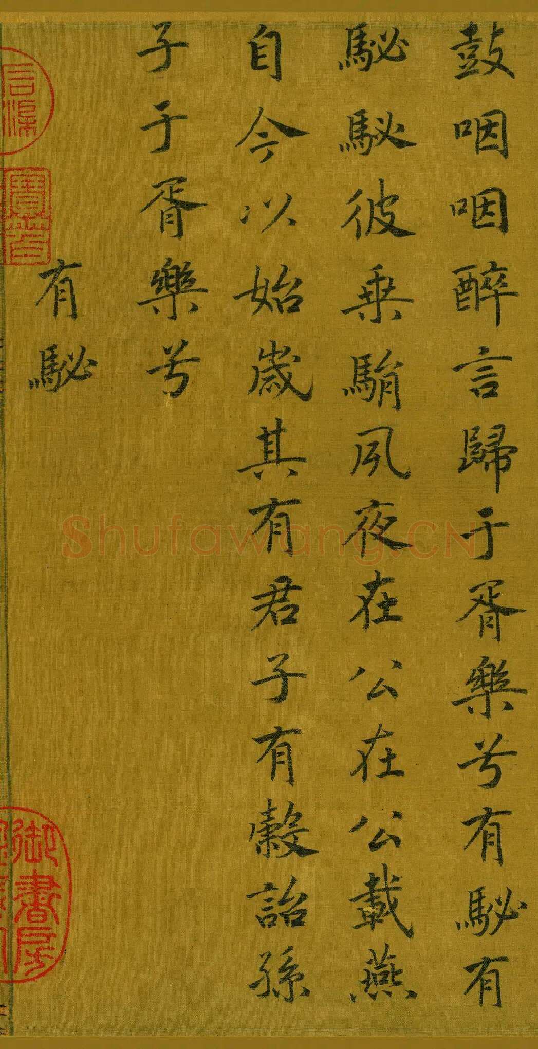 【6】鼓咽咽,醉言归。于胥乐兮!有駜有駜,駜彼乘駽。夙夜在公,在公载燕。自今以始,岁其有。君子有穀,诒孙子。于胥乐兮!《有駜》