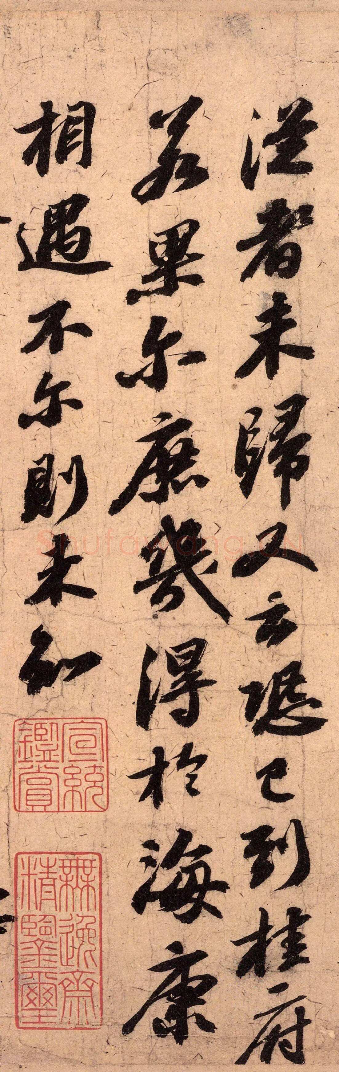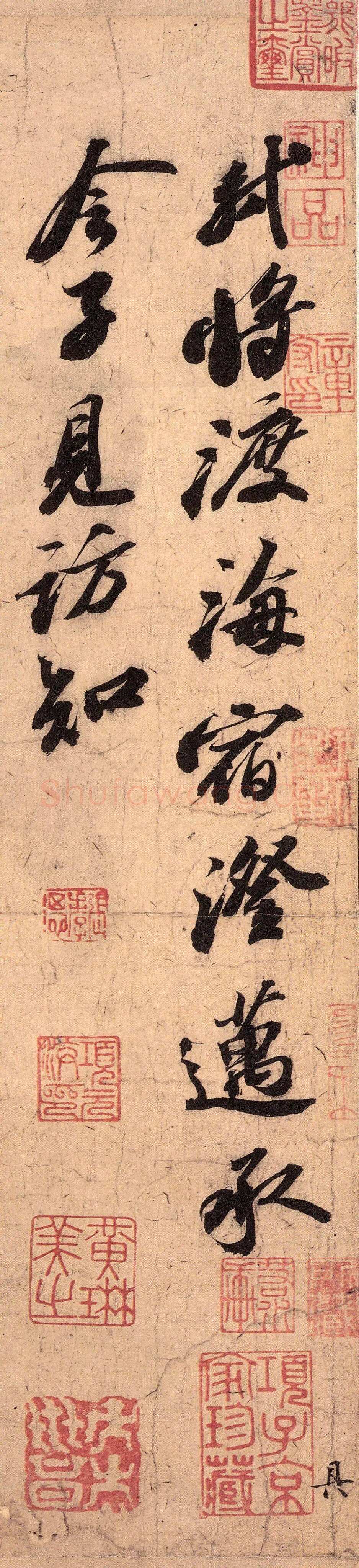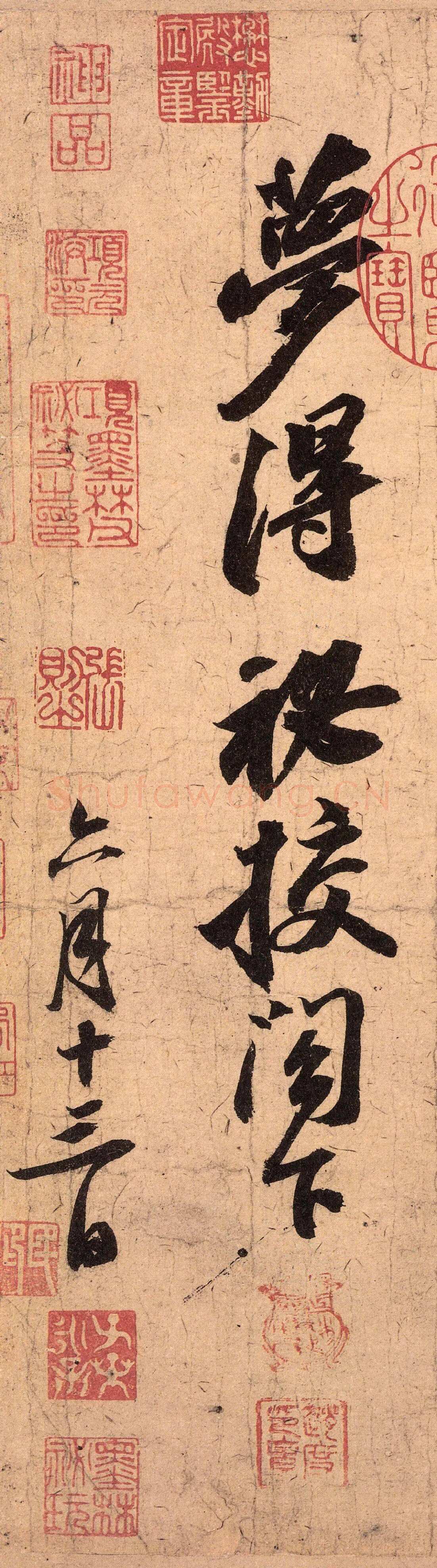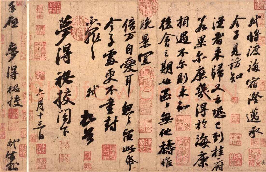 【释文】轼将渡海,宿澄迈,承令子见访,知从者未归。又云,恐已到桂府。若果尔,庶几得于海康相遇;不尔,则未知后会之期也。区区无他祷,惟晚景宜倍万自爱耳。匆匆留此纸令子处,更下重封,不罪不罪。轼顿首,梦得秘校阁下。六月十三日。封囊:手启,梦得秘校。轼封。
