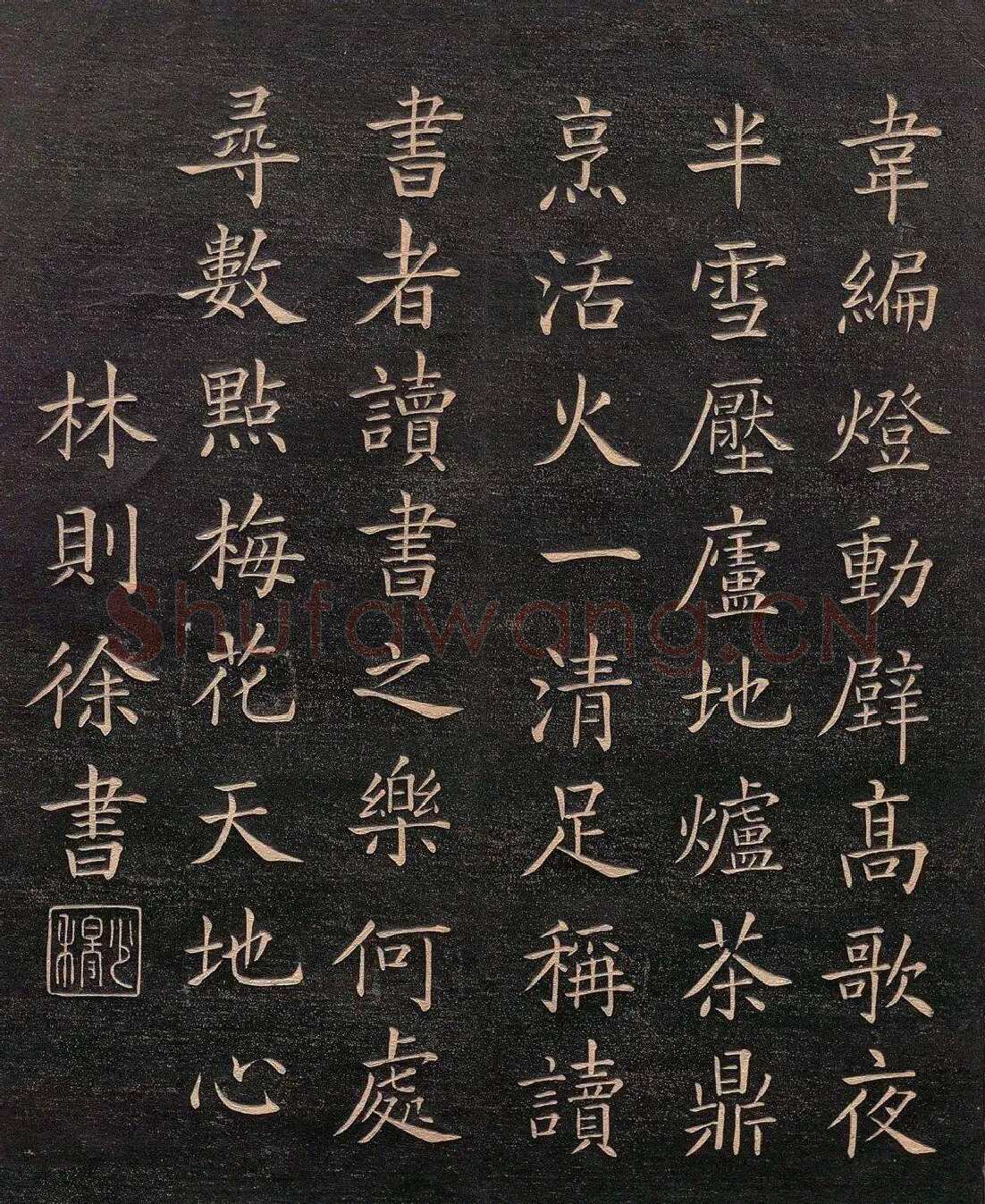 【5】韦编灯动壁,高歌夜半雪压庐。地炉茶鼎烹活火,四壁图书中有我。读书之乐何处寻?数点梅花天地心。(林则徐书)