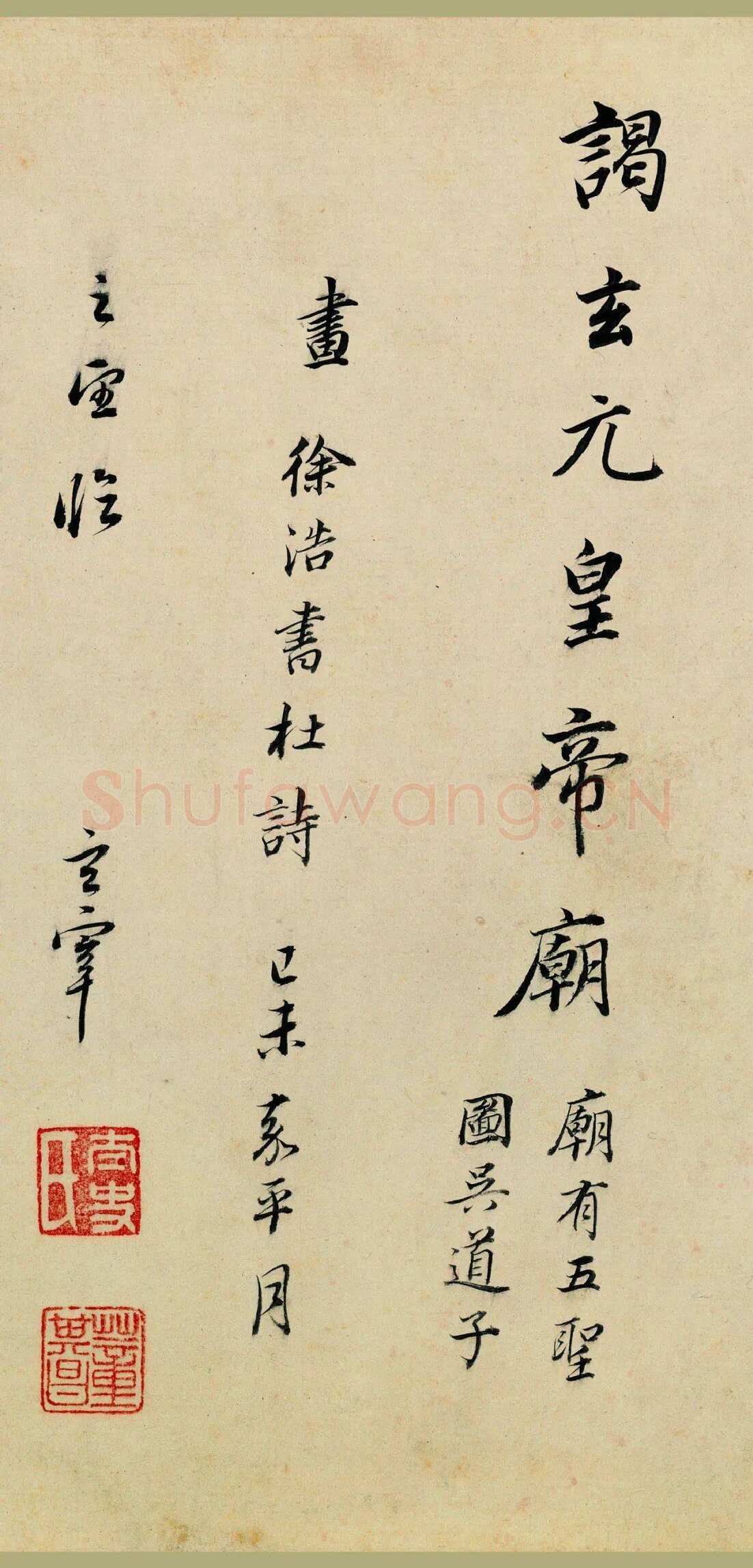 【7】谒玄元皇帝庙,庙有《五圣图》,图吴道子画,徐浩书杜诗。乙未年平月之望临,玄宰。