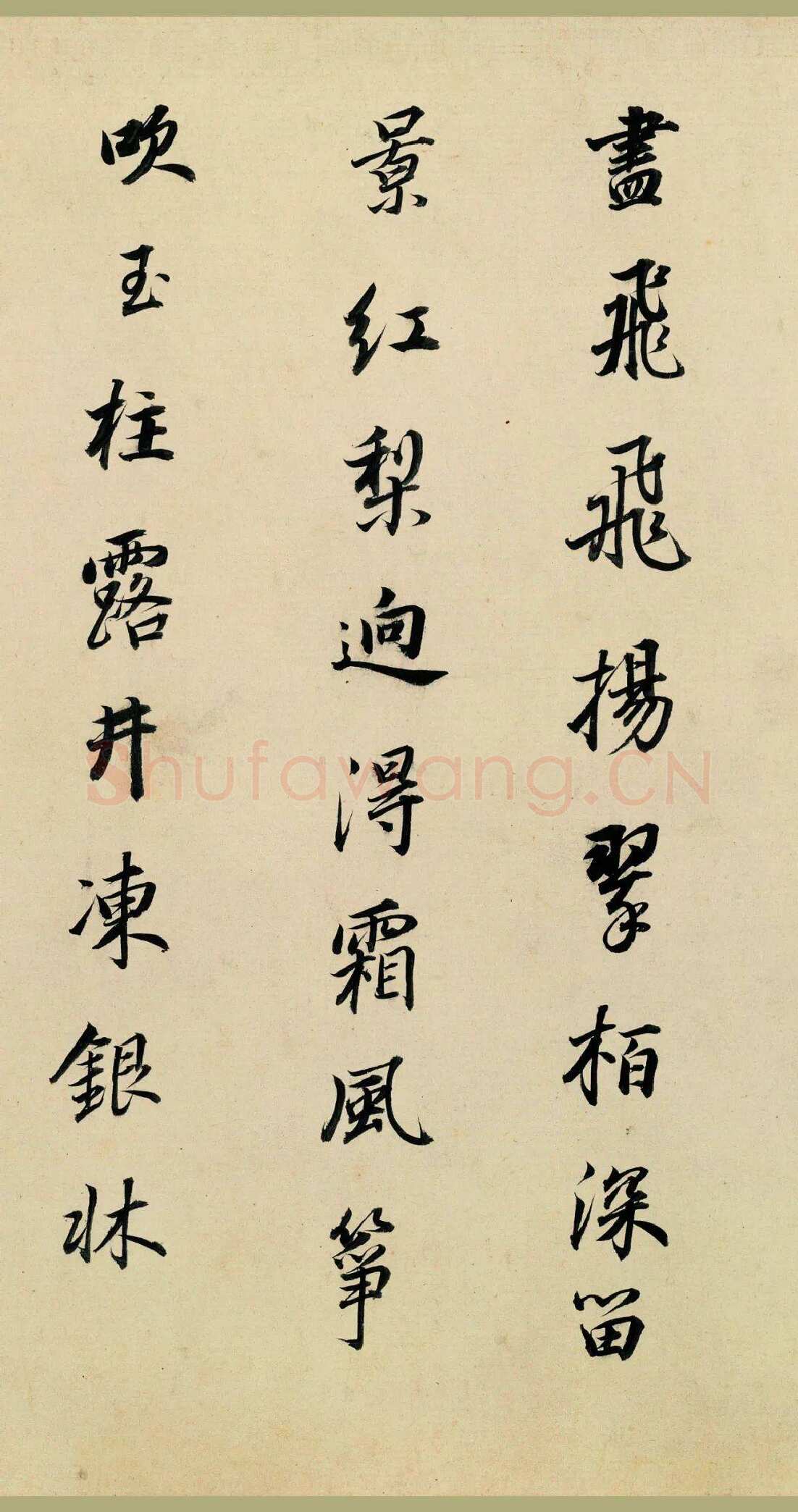 【5】尽飞扬。翠柏深留景,红梨迥得霜。风筝吹玉柱,露井冻银床。