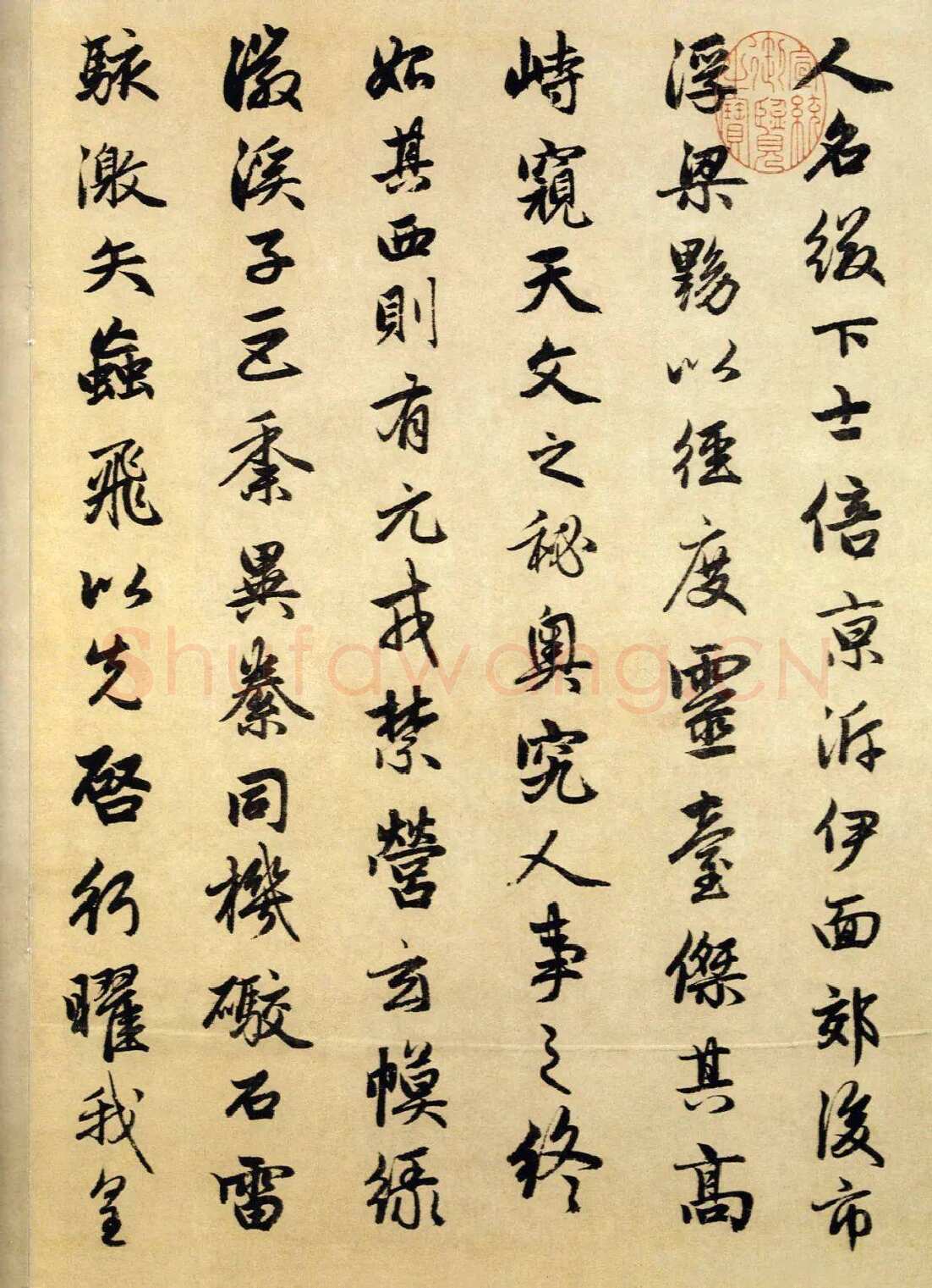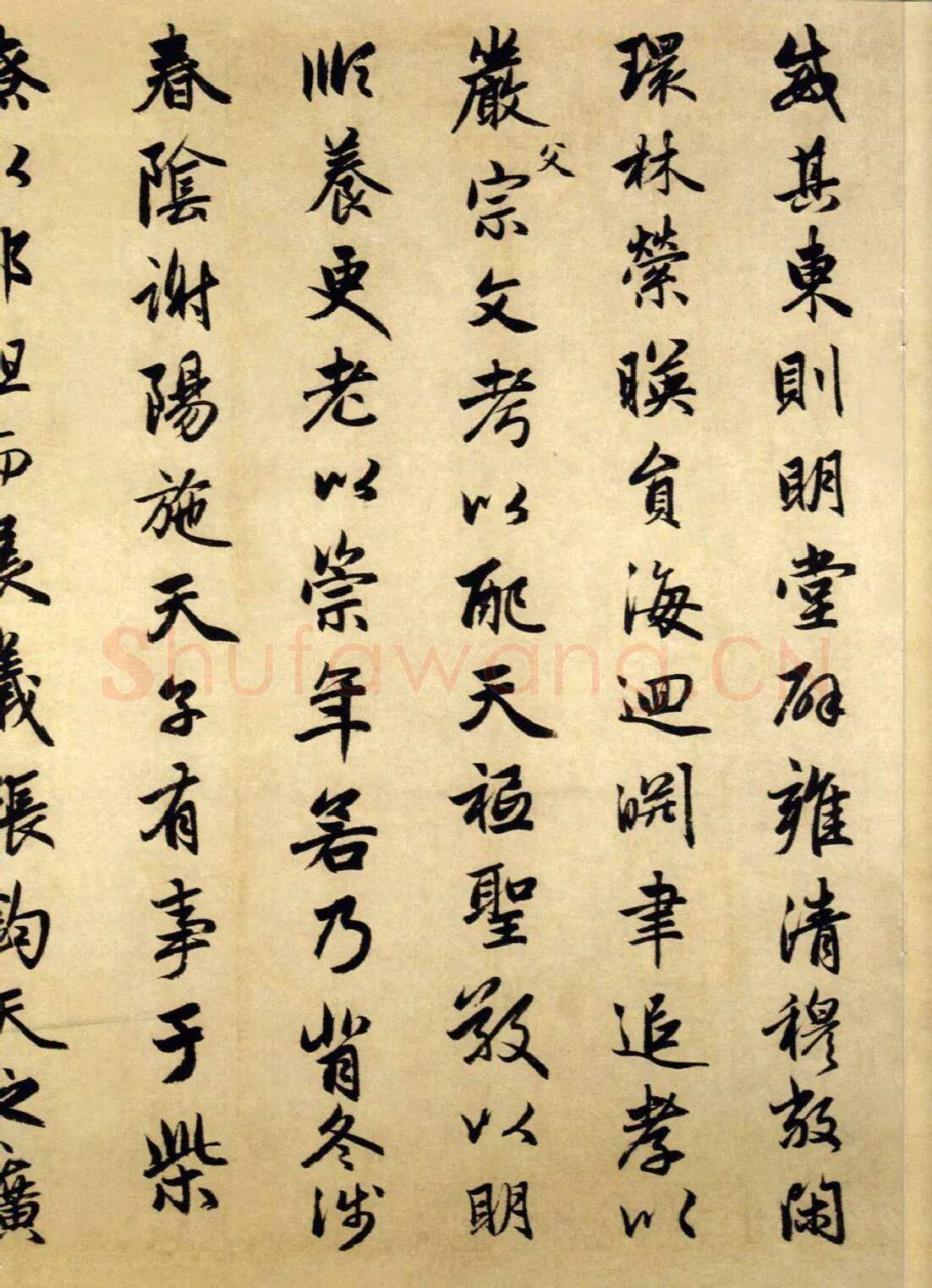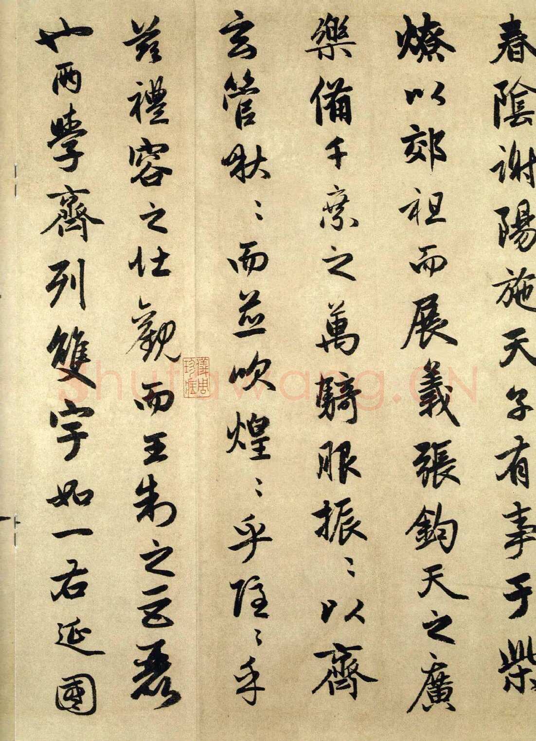 【释文】《闲居赋》傲坟素之长圃,步先哲之高衢。虽吾颜之云厚,犹内愧于宁蘧。有道余不仕,无道吾不愚。何巧智之不足,而拙艰之有余也!于是退而闲居,于洛之涘。身齐逸民,名缀下士。背京溯伊,面郊后市。浮梁黝以迳度,灵台杰其高峙。窥天文之秘奥,睹人事之终始。其西则有元戎禁营,玄幕绿徽,溪子巨黍,异絭同归,砲石雷骇,激矢虻飞,以先启行,耀我皇威。其东则有明堂辟雍,清穆敞闲,环林萦映,圆海回泉,聿追孝以严父,宗文考以配天,祗圣敬以明顺,养更老以崇年。若乃背冬涉春,阴谢阳施,天子有事于柴燎,以郊祖而展义,张钧天之广乐,备千乘之万骑,服枨枨以齐玄,管啾啾而并吹,煌煌乎,隐隐乎,兹礼容之壮观,而王制之巨丽也。两学齐列,双宇如一,右延国胄,左纳良逸。祁祁生徒,济济儒术,或升之堂,或入之室。教无常师,道在则是。故髦士投绂,名王怀玺,训若风行,应犹草靡。此里仁所以为美,孟母所以三徙也。爰定我居,筑室穿池,长杨映沼,芳枳树樆,游鳞瀺灂,菡萏敷披,竹木蓊蔼,灵果参差。张公大谷之梨,梁侯乌椑之柿,周文弱枝之枣,房陵朱仲之李,靡不毕植。三桃表樱胡之别,二奈耀丹白之色,石榴蒲桃之珍,磊落蔓延乎其侧。梅杏郁棣之属,繁荣藻丽之饰,华实照烂,言所不能极也。菜则葱韭蒜芋,青笋紫姜,堇荠甘旨,蓼荾芬芳,蘘荷依阴,时藿向阳,绿葵含露,白薤负霜。于是凛秋暑退,熙春寒往,微雨新晴,六合清朗。太夫人乃御版舆,升轻轩,远览王畿,近周家园,体以行和,药以劳宣,常膳载加,旧痾有痊。于是席长筵,列孙子柳垂阴,车结轨,陆摘紫房,水挂赪鲤,或宴于林,或禊于汜。昆弟斑白,兒童稚齿,称万寿以献觞,咸一惧而一喜。寿觞举,慈颜和,浮杯乐饮,丝竹骈罗,顿足起舞,抗音高歌,人生安乐,孰知其他。退求已而自省,信用薄而才劣。奉周任之格言,敢陈力而就列。几陋身之不保,而奚拟乎明哲,仰众妙而绝思,终优游以养拙。
