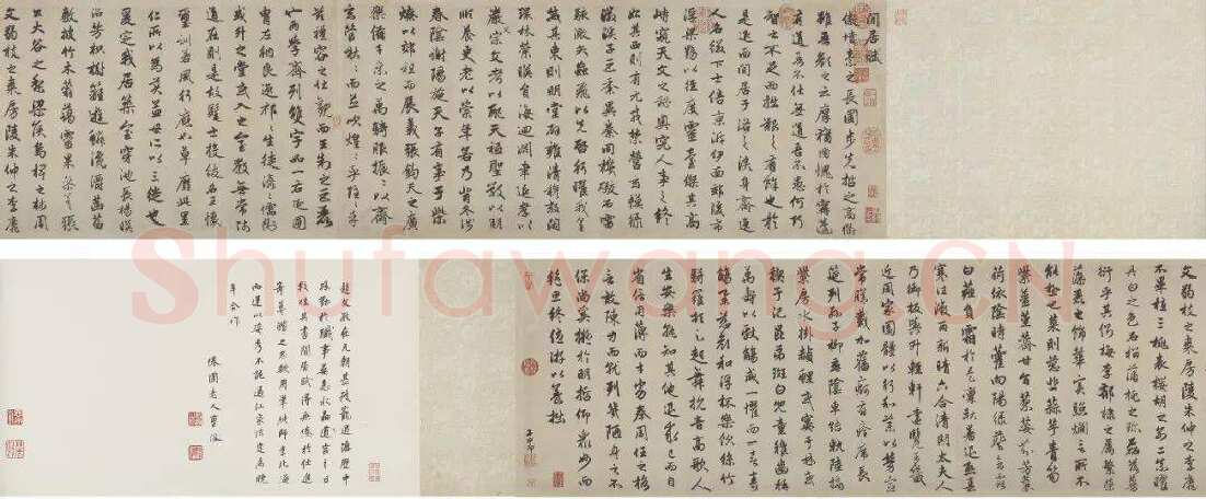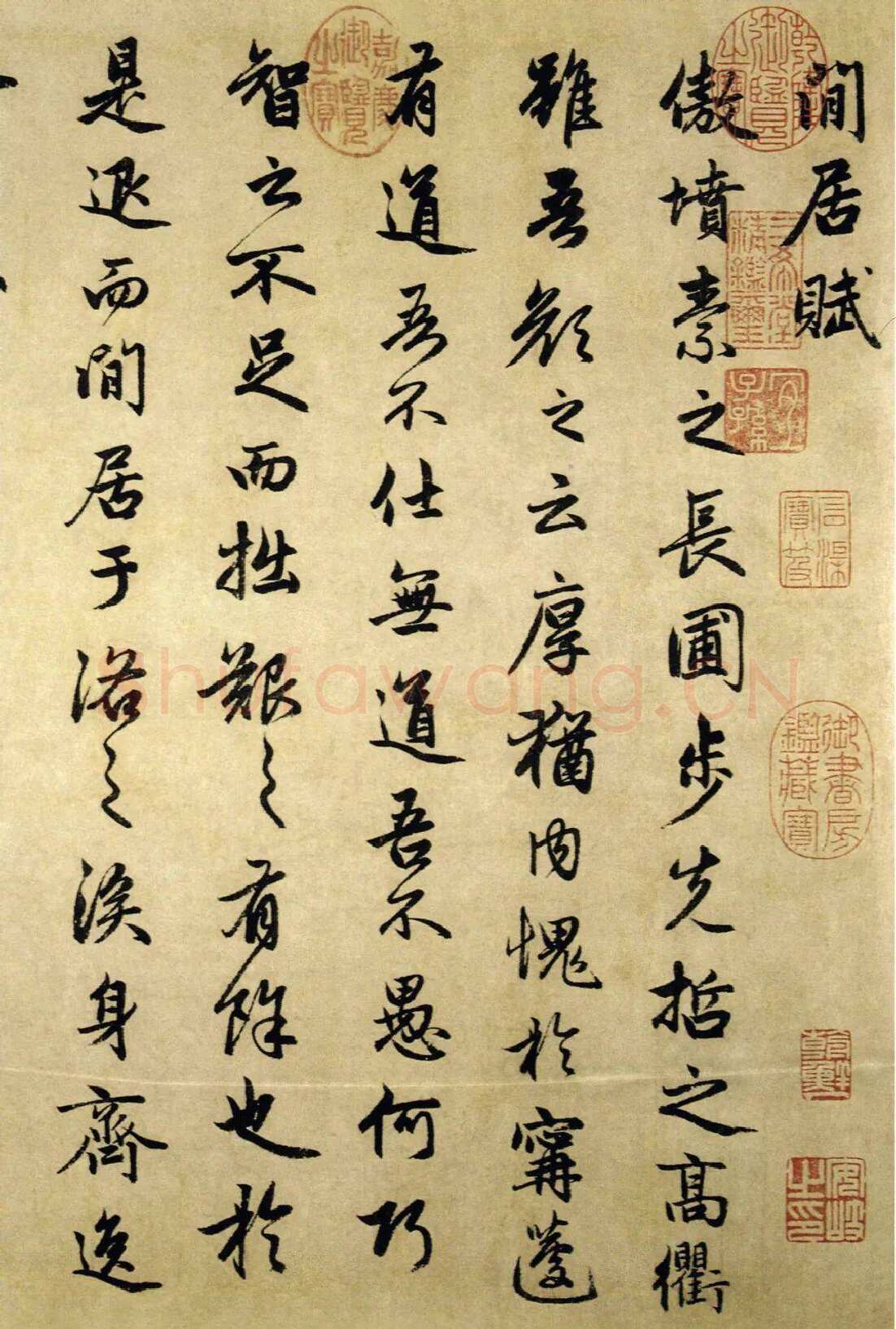 赵孟頫《闲居赋》行楷,纵38厘米,横248.3厘米 ,台北故宫博物院藏,书西晋著名文学家潘岳《闲居赋》一首,56行,凡627字,款署子昂。 此作无年款,但从书法上考察,应是晚年所书,为赵孟頫上乘之作。卷末有清曹溶题跋。