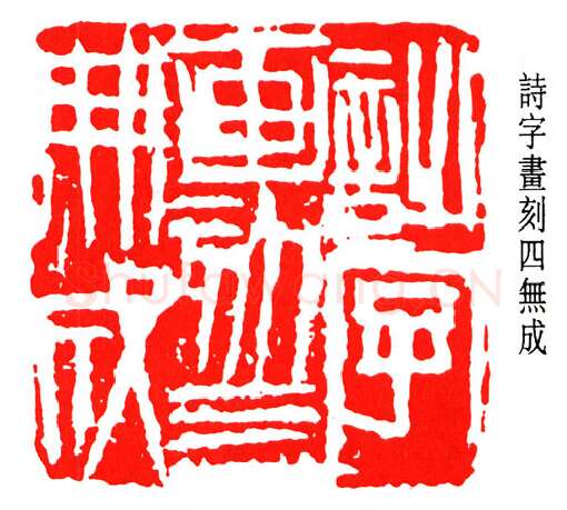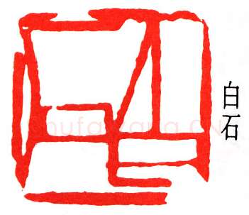 白石之治印也,尝自言:『余之刻印,始於二十岁以前,最初自刻名字印,友人黎松庵借以丁、黄印谱原拓本,得其门径。後数年,得《二金蝶堂印谱》,方知老实为正,疏密自然,乃一变。再後喜《天发神谶碑》,刀法一变。再後喜穴三公山碑》,篆法一变。最後喜秦权纵横平直,一任自然,又一大变。』其四变轨迹,言之甚明。然学印之最早年岁,《白石老人自述》谓始於年卅四。以廿七岁方得从师习文艺推之,则《自述》所叙,当较确当。白石之印,纵横排□,气魄过人,除前述渊源外,谅亦得族汉将军印、少数民族头领之所谓『蛮夷印』所启迪,章法注意虚实之强烈对比,用刀泼辣,不加修饰,任其欹斜剥落,以增奇趣。白石曾云:『刻印其篆法别有天趣胜人者,唯秦汉人。秦汉人有遇人处,全在不蠢,胆敢独造,故能超出千古。余刻印不拘前人绳墨,而时俗以为无所本。余尝哀时人之蠢:不思秦汉人,人子也;吾侪亦人子也;不思吾侪有独到处,如令昔人见之,亦必钦佩。』复有诗曰:『做摹蚀削可愁人,与世相违我辈能;快剑断蛟成死物,昆刀截玉露泥痕。』俱见旨趣。
