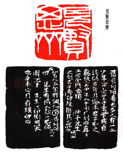 印人杨仲子,白石至友也,尝评其印云:『齐白石力量有余,若再加书卷味,则为完全无缺之人,然为之继,亦非易事。……故刻印者,能尽石之长,彰石之美,不强其性,不塞其能,方可谓之高手。白石时有之,他人不多见也,白石刻印,其刀直下,长可寸许,深可半米,石不坚硬、立时崩裂,风驰电掣、顷刻而成。石不转方,自左连切而极於右,亦刻印之奇观也。』识者或谓知言,或不满於『书卷味』一语,似有贬意。白石曾告其门人于非合,自谓诸艺以刻印为第一,盖能不落古人窠臼