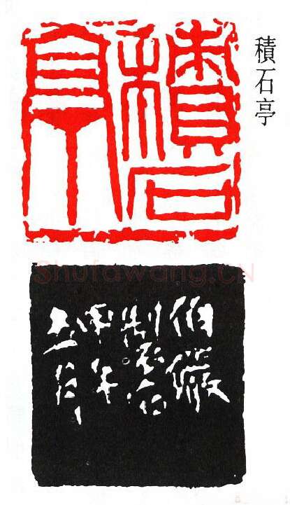 伯翁於印用功之深似不下於画。缶翁印作固临摹精察殆遍,而於先秦古玺、汉晋古印,及明清名家印,亦多所涉猎,所携即置之古人谱录中,不独难辨,直是佳选。曾见其印蜕数轴,个老跋语皆以『刀法古穆,趣味横生』、『刀法高浑有味』誉之。晚岁所作,尤雄浑朴厚,气息高古。