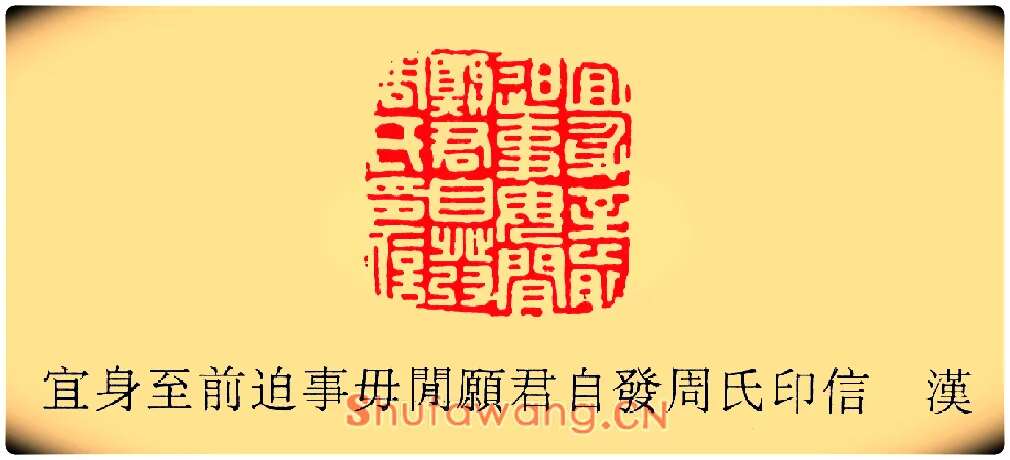 书体:玺印出处:宜身至前迫事毋□願君自發周氏印信 漢备注说明:宜身至前迫事毋□願君自發周氏印信漢 (宜身至前迫事毋閒,闲願,愿君自發,发周氏印信)玺印作品图片欣赏,说明:宜身至前迫事毋□願君自發周氏印信 漢