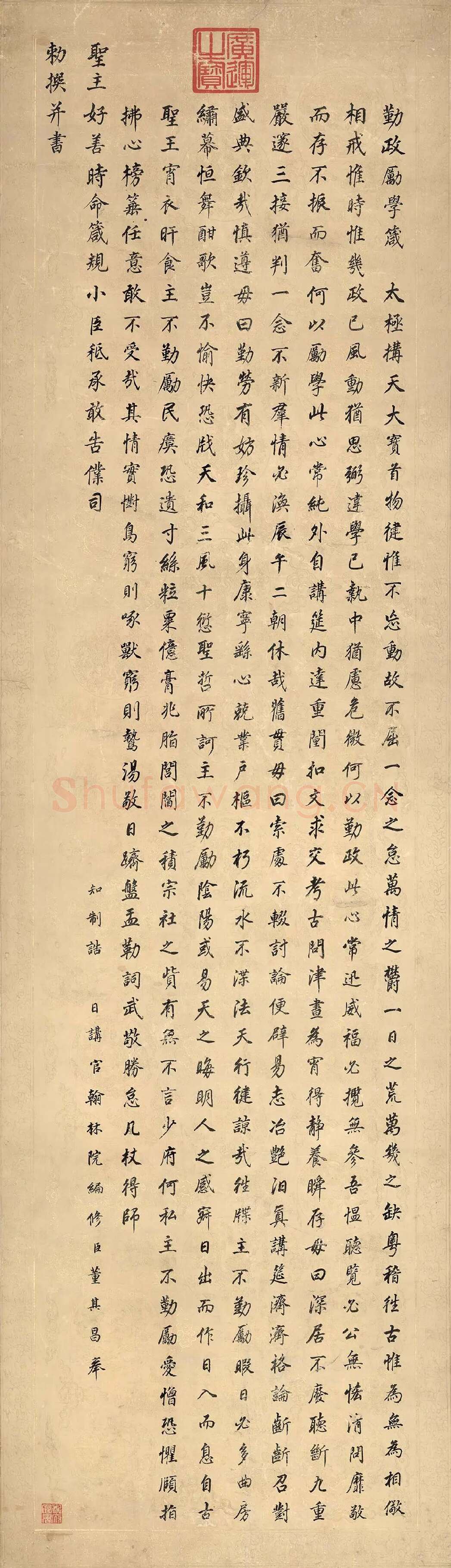 董其昌楷书《勤政励学箴》轴为董其昌奉敕撰文并书,是其一生中最为着力的一件作品。从书法艺术角度看,这是现存董氏诸多墨迹中极为精彩的一幅。